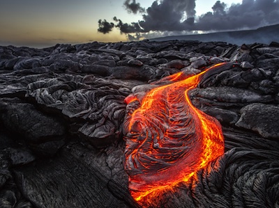 - Effusive eruptions occur from the summit caldera area and from fissures along the flanks. Lava flows reach the ocean.
