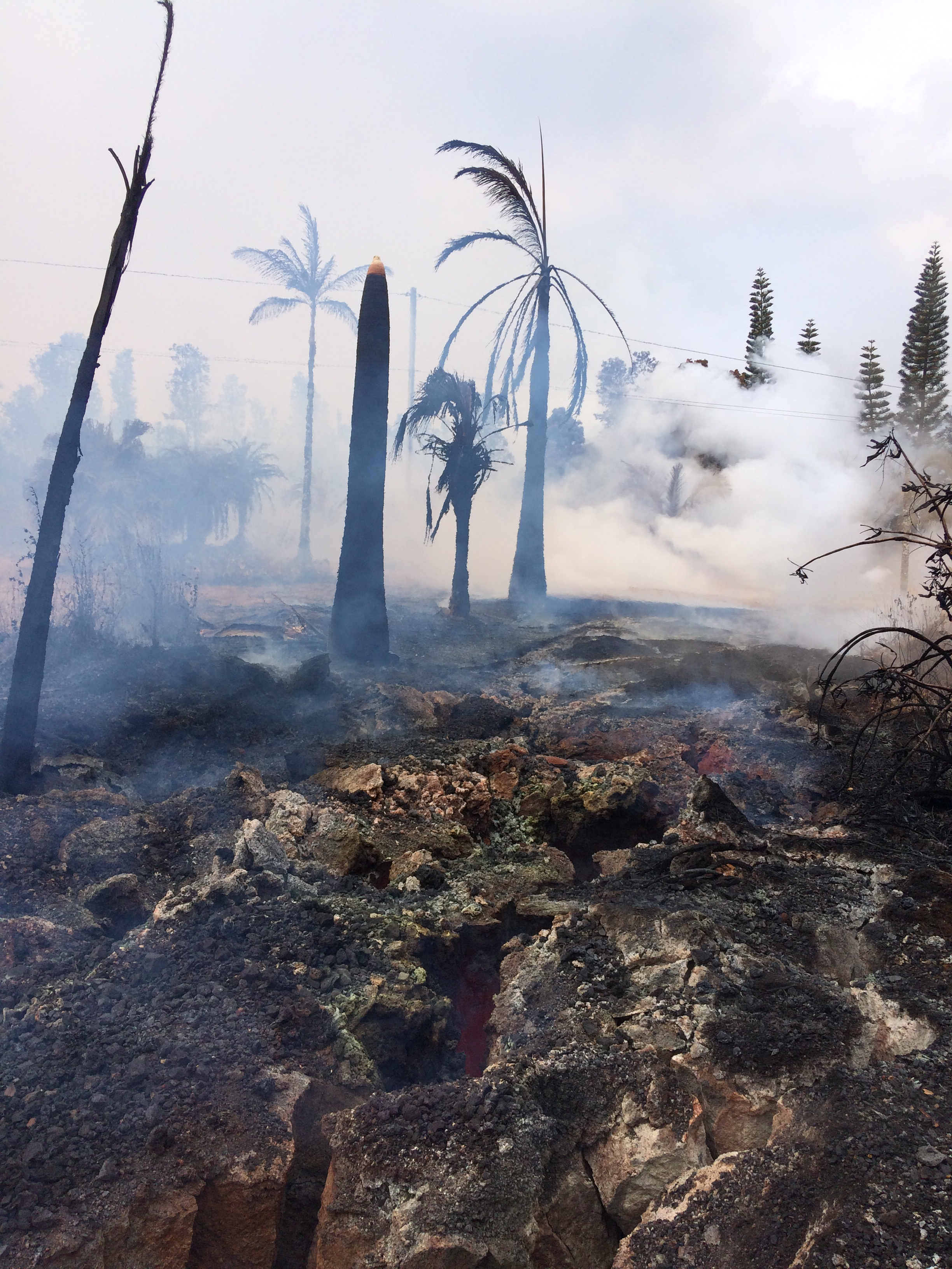 The photo on the right shows deep cracks, burned trees, and gas around fissure 14. Image credits: U.S. Geological Survey |