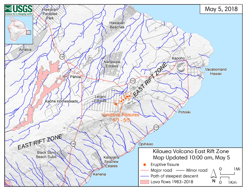 Description: This map shows locations of fissures 7–8 (opened May 5), along with previously-opened fissures 1–6. The blue lines show the paths of steepest descent. Source: U.S. Geological Survey |