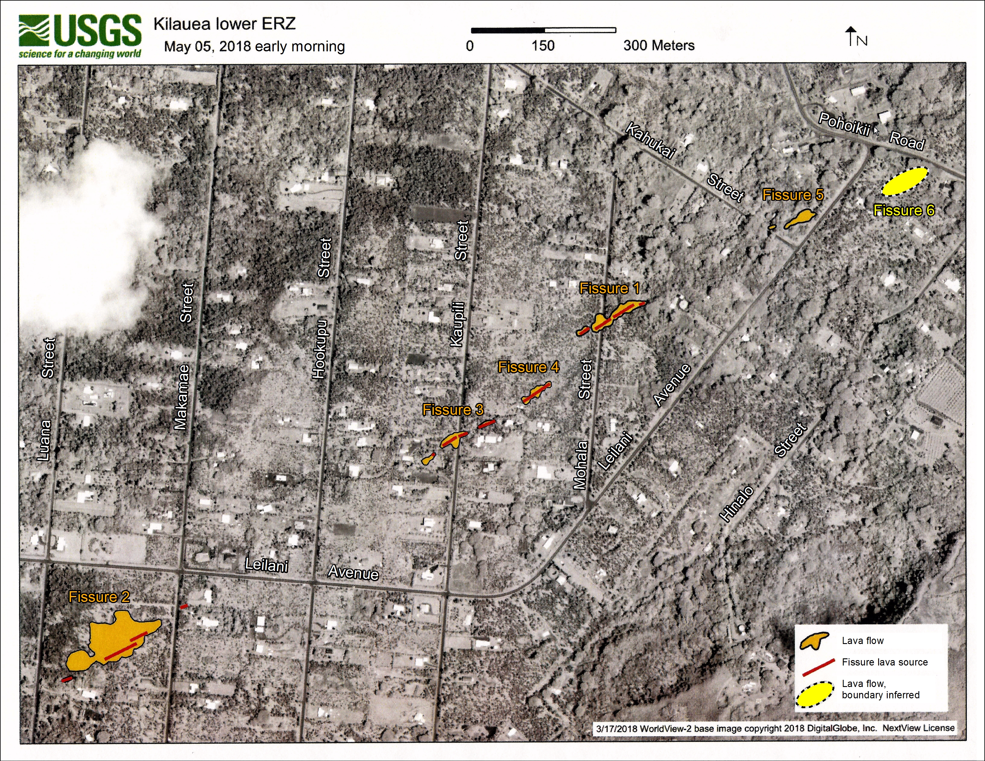 Description: This satellite image shows fissures 1–5 and lava-covered areas of Leilani Estates in Kīlauea Volcano’s East Rift Zone on May 5, 2018. Source: U.S. Geological Survey Satellite image ©2018 DigitalGlobe, a Maxar company |