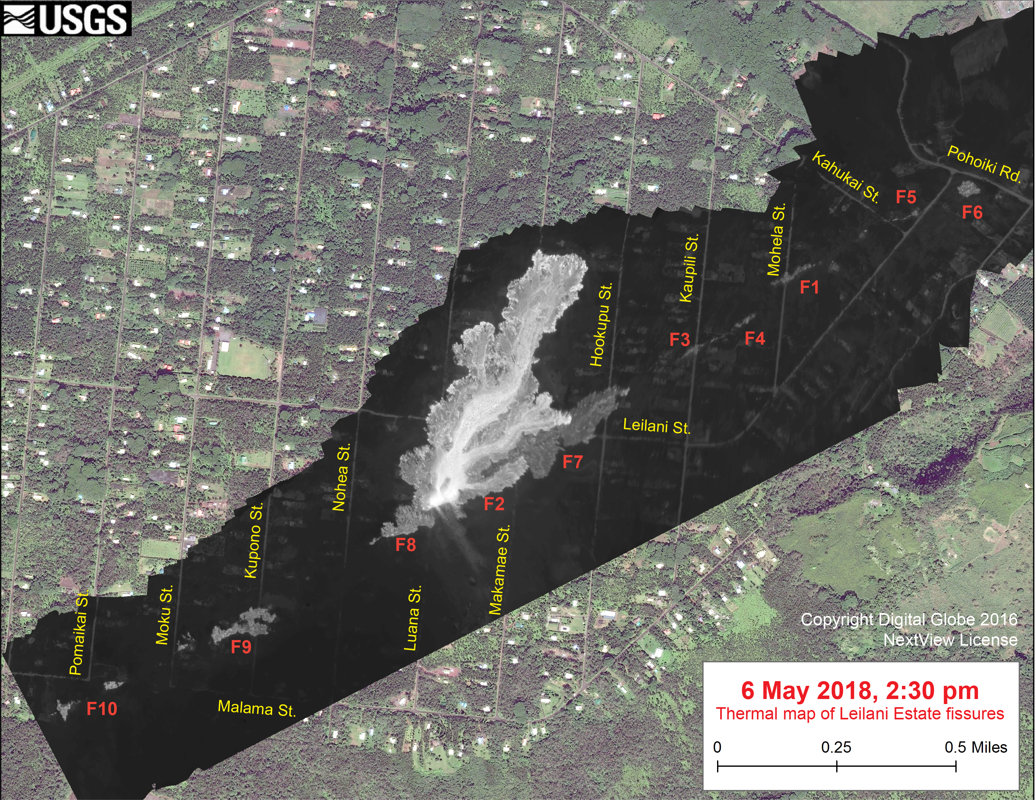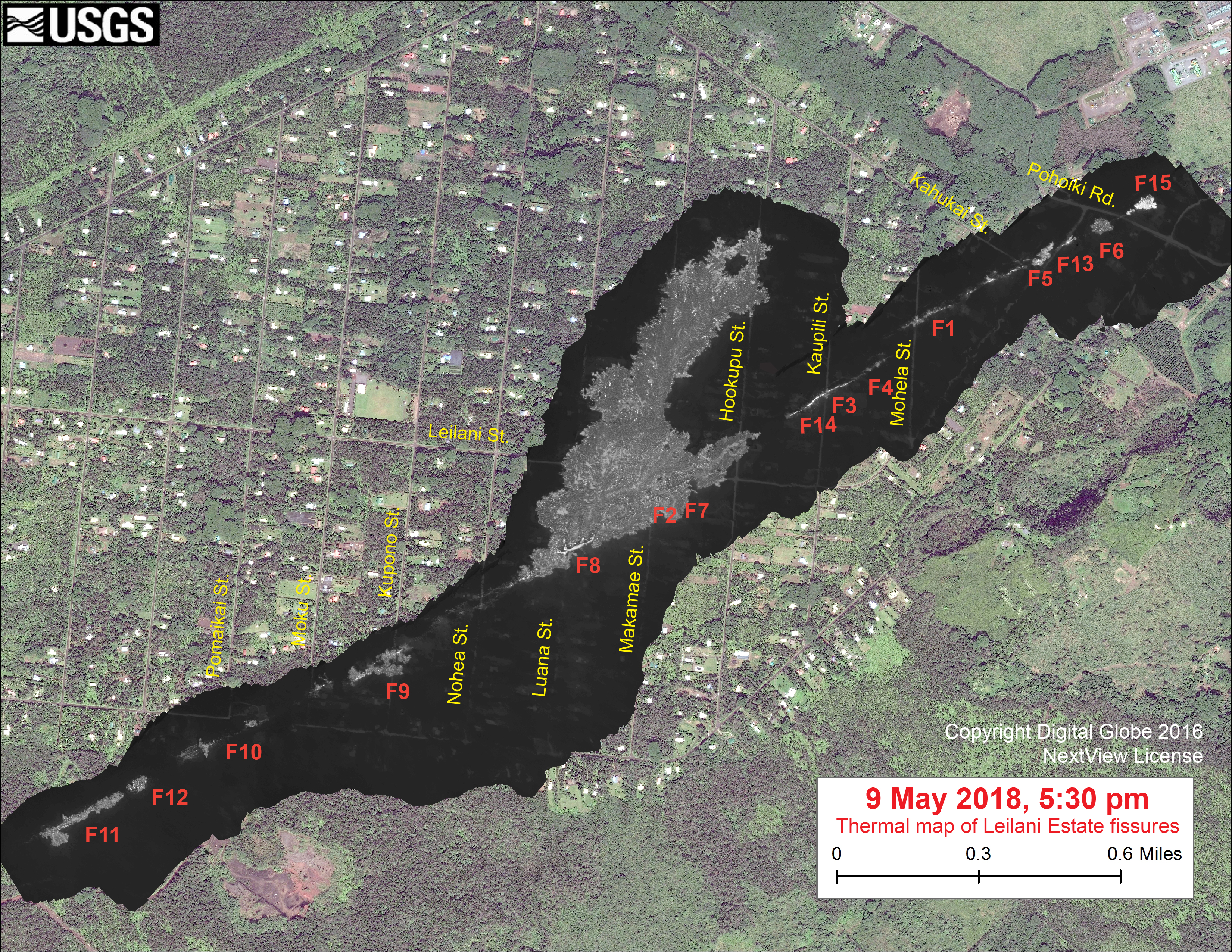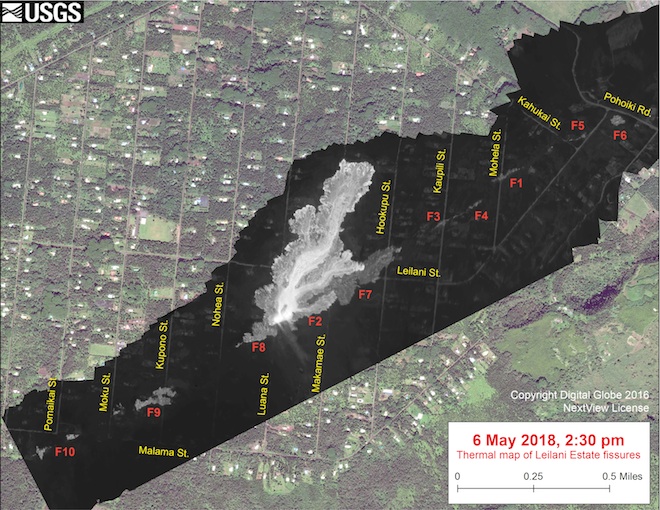 Description: This thermal map, created at 2:30 PM on May 6, 2018, shows fissures 9–10 (opened May 6) along with previously-opened fissures 1–8 in Kīlauea Volcano’s East Rift Zone.