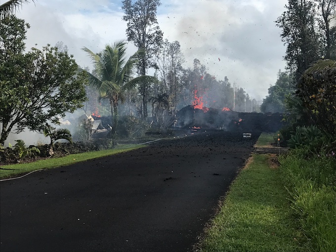 Description: This photo, taken at 8:07 AM on May 4, 2018, shows lava and gas spewing from fissure 3 at Leilani and Kaupili Streets in the Leilani Estates neighborhood. Lava on the road was approximately 2 m (~6.5 ft) high. Image credit: U.S. Geological Survey |