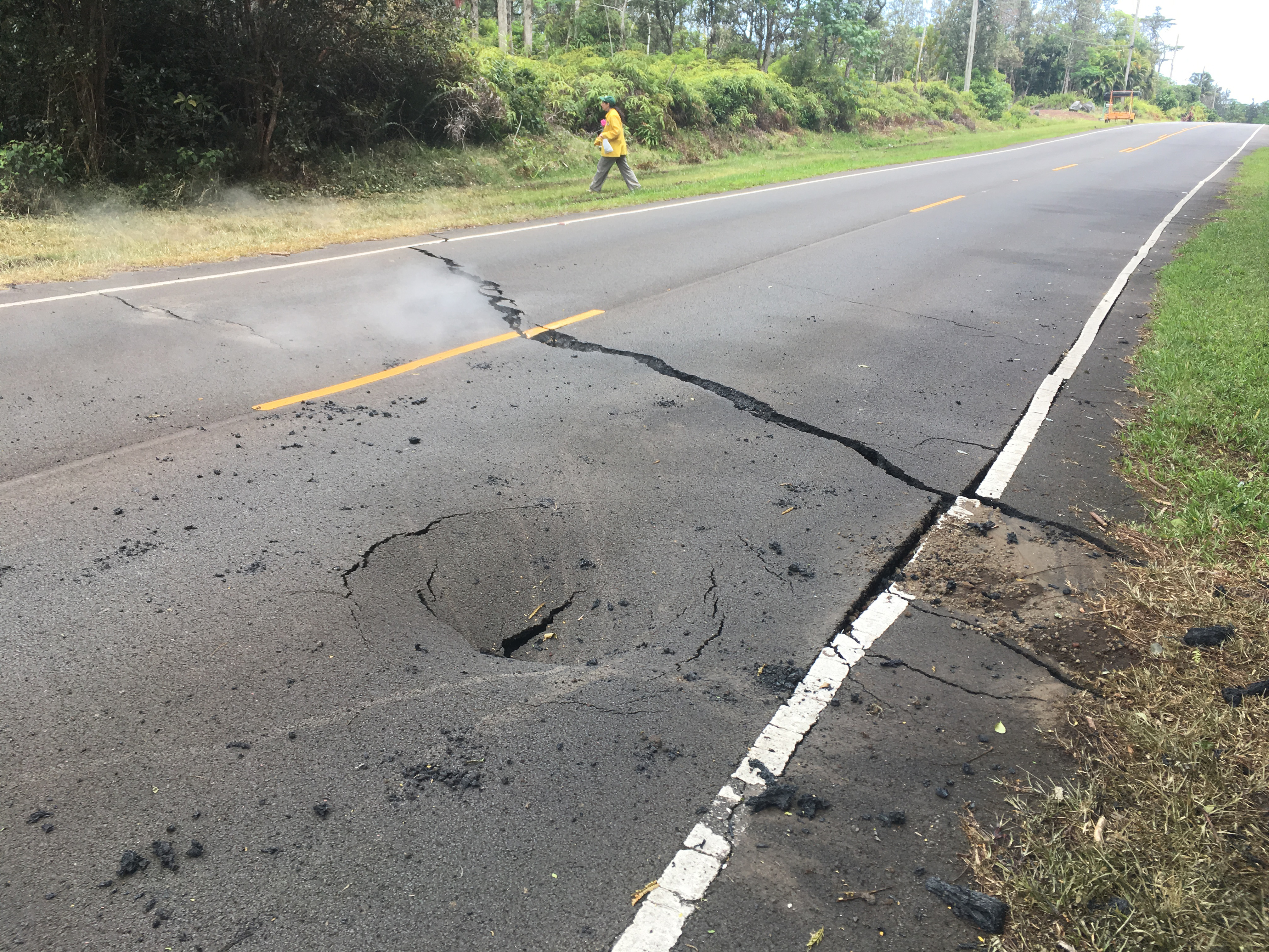Description: This photo shows a newly opened crack on Pohoiki road in Leilani Estates on May 5, 2018. Image Credit: U.S. Geological Survey |