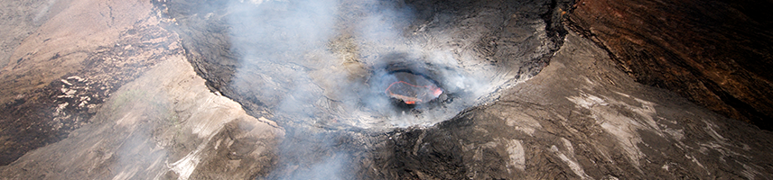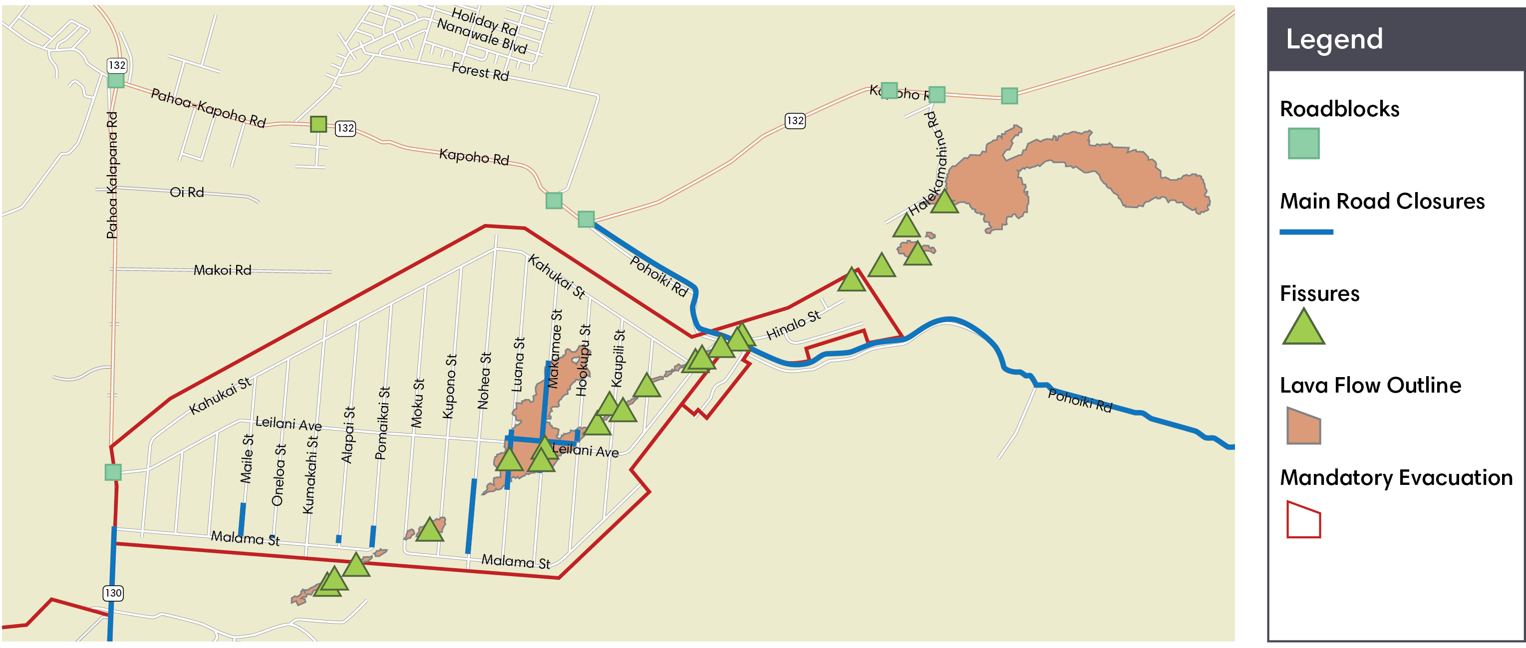 On May 3, 2018, a new eruption of Kīlauea Volcano began in the Leilani Estates neighborhood located in the lower East Rift Zone. Lava, hot water vapor, and gas fumes started spewing into the air from a newly-opened crack in the earth, and lava flowed slowly outward about 10 meters from this fissure.